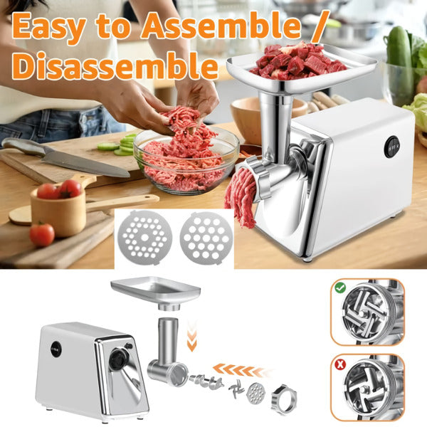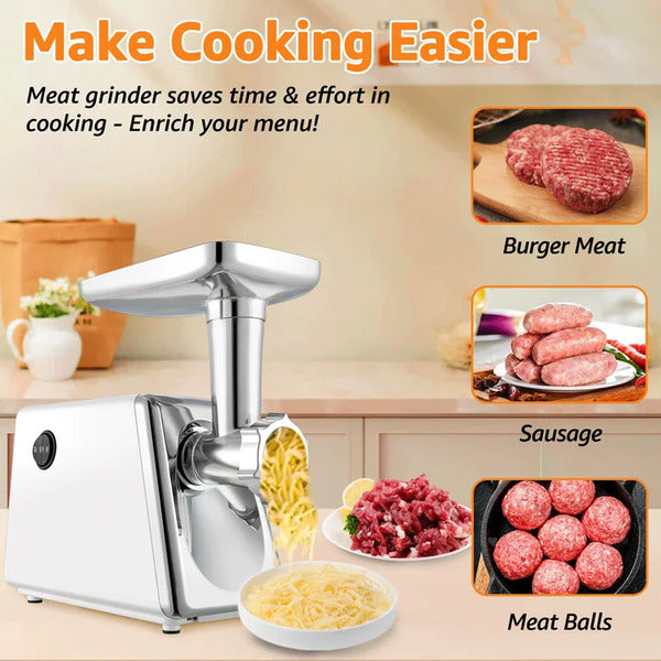 Această mașină nu se limitează doar la tocat carne – este perfectă pentru a prepara burgeri, cârnați de casă, chiftele și multe altele.